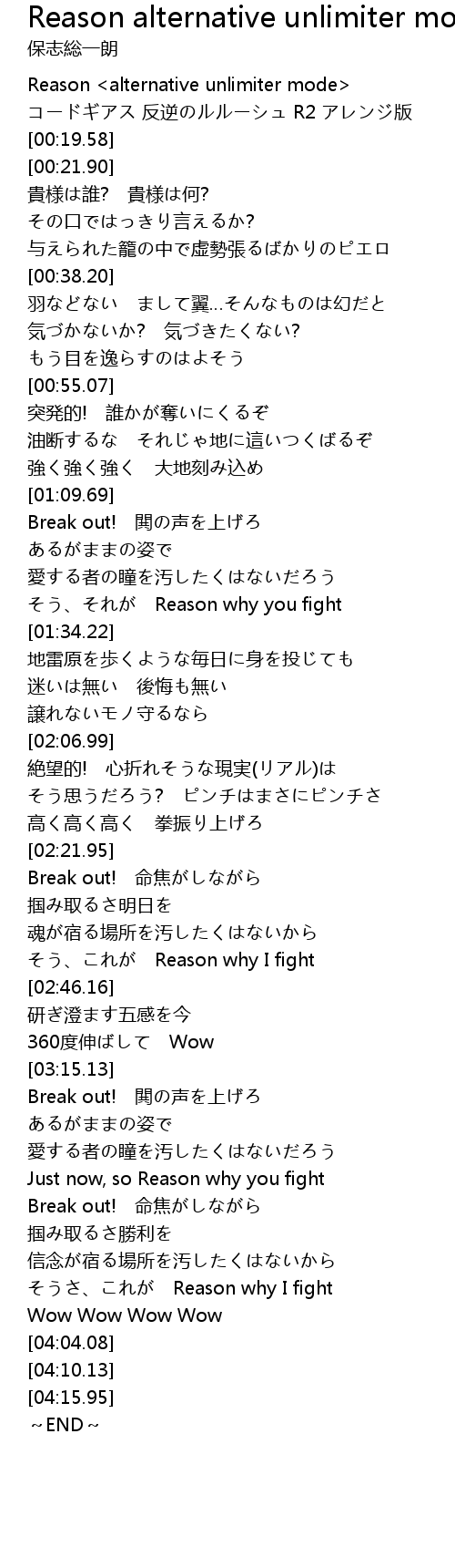 | [00:03.53] | コードギアス 反逆のルルーシュ R2 アレンジ版 |