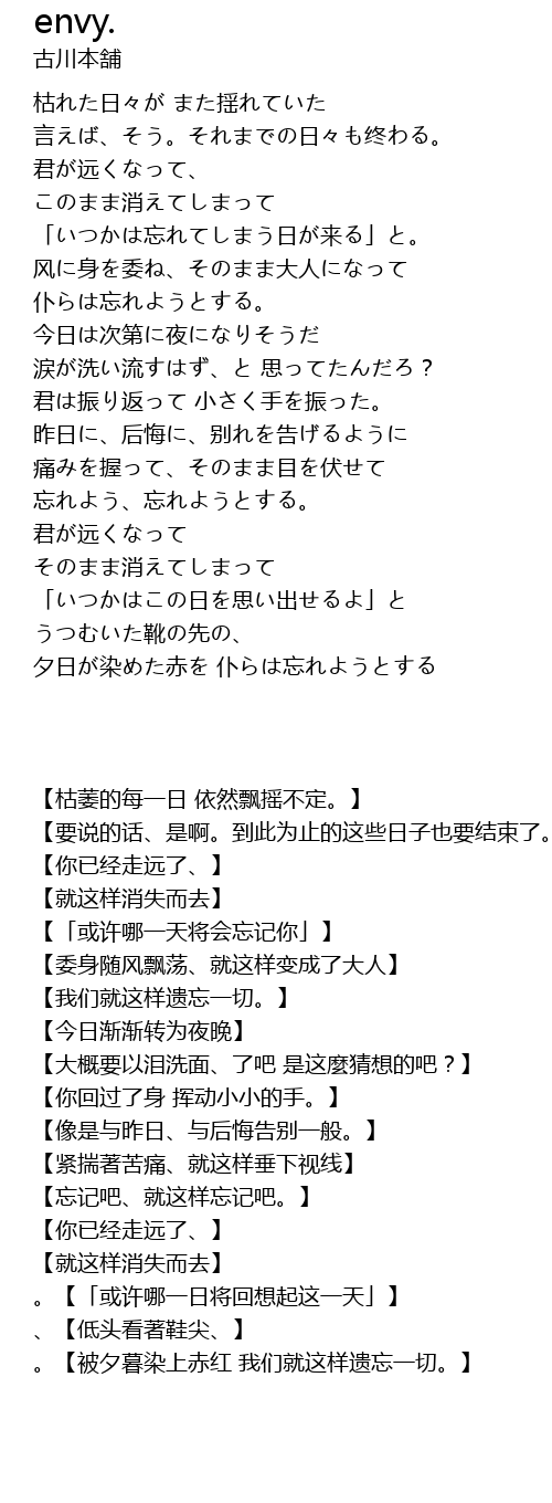 | [03:06.61] | 夕日が染めた赤を 仆らは忘れようとする |