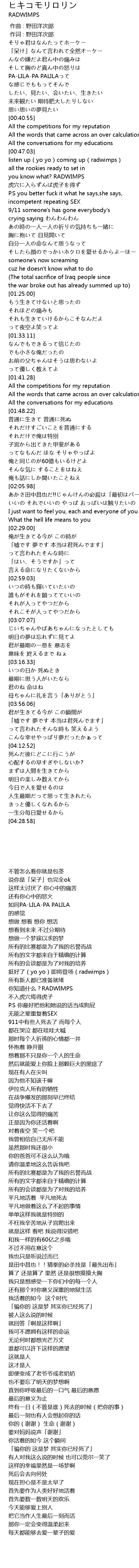 | [00:49.05] | listen up(yo yo)coming up(radwimps) |