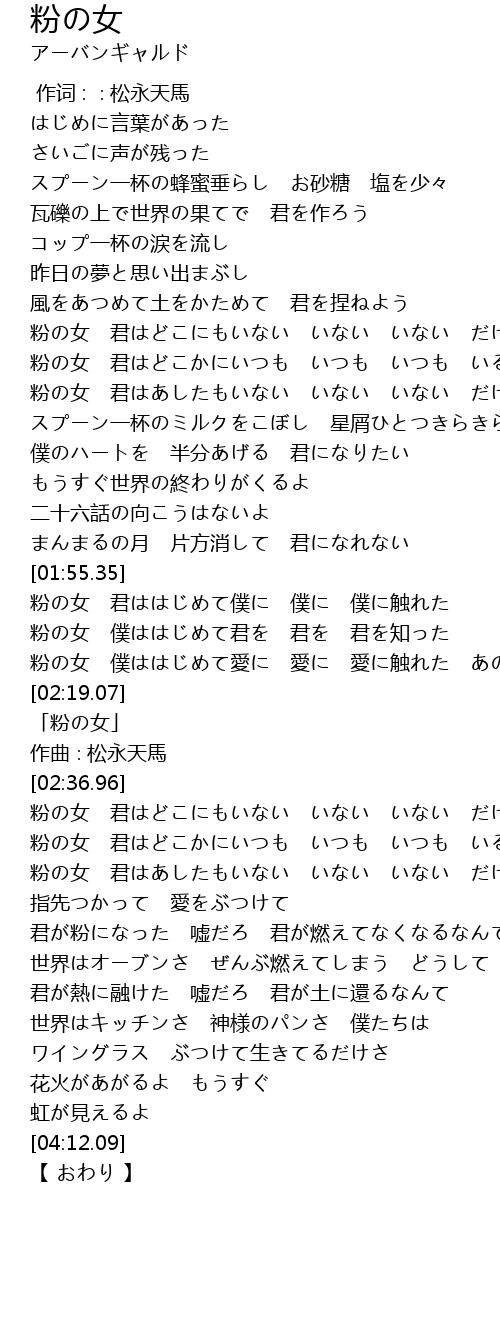 | [02:03.19] | 粉の女 僕ははじめて君を 君を 君を知った |