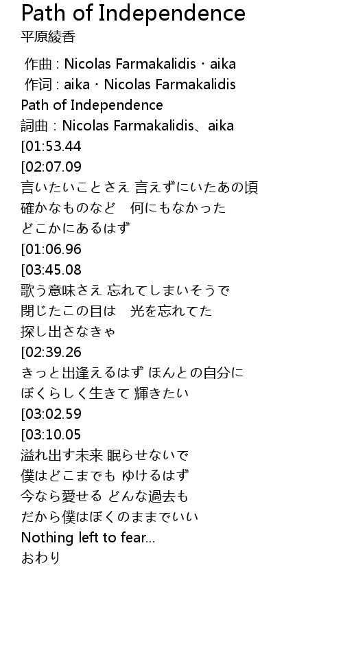 | [00:10.00][01:53.44][03:16.45] | 平原綾香-Path of Independence |