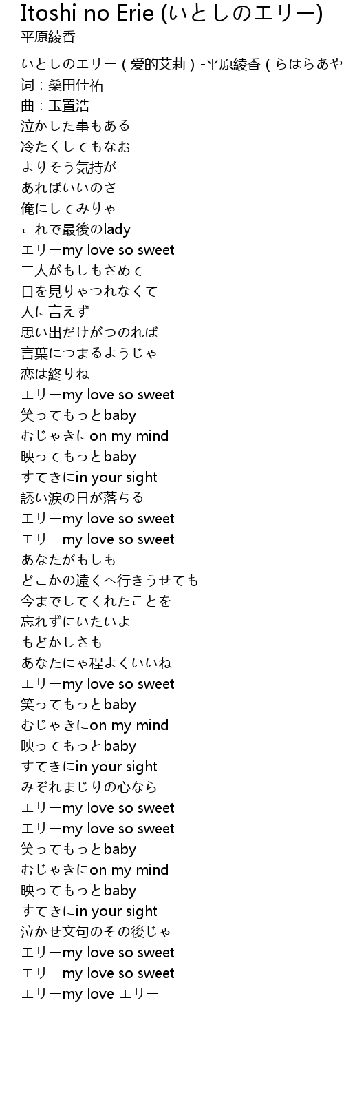 | [00:00.00] | いとしのエリー(爱的艾莉)-平原綾香(らはらあやか) |