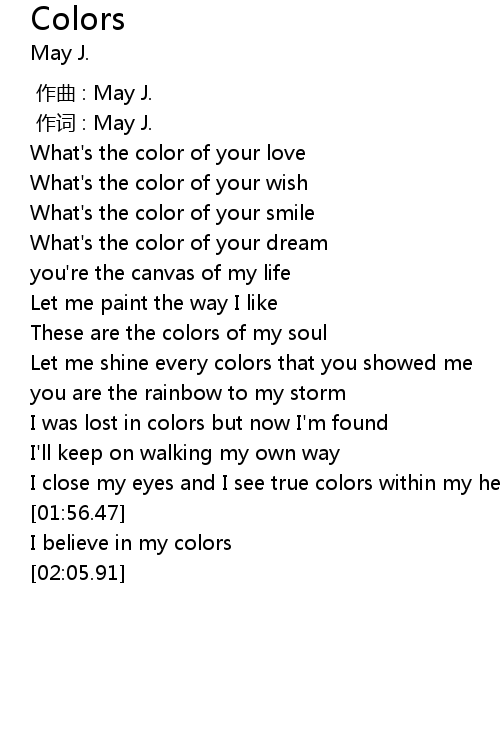 | [01:41.77] | I close my eyes and I see true colors within my heart |