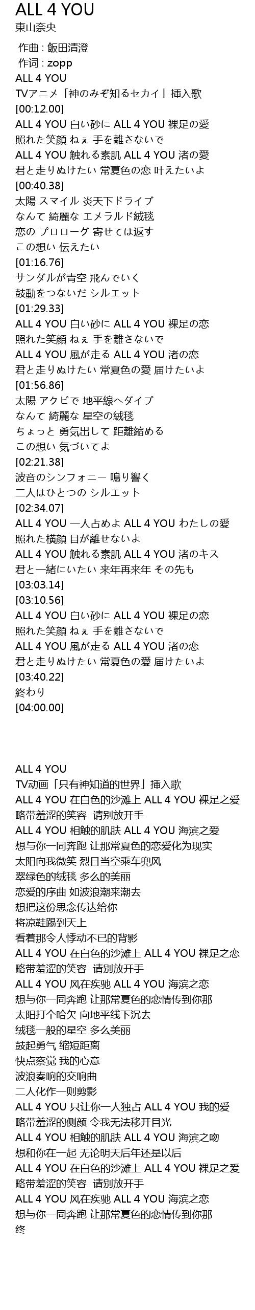| [00:12.51] | ALL 4 YOU 白い砂に ALL 4 YOU 裸足の愛 |