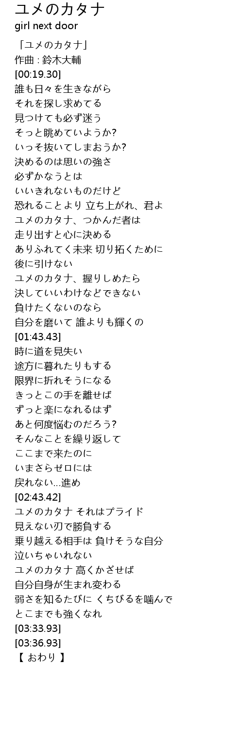 | [02:58.60] | ユメのカタナ それはプライド |