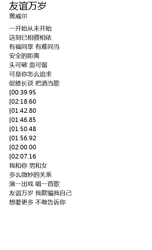 | [02:38.89][02:00.00][01:03.65] | 友谊万岁 只好安慰自己 |