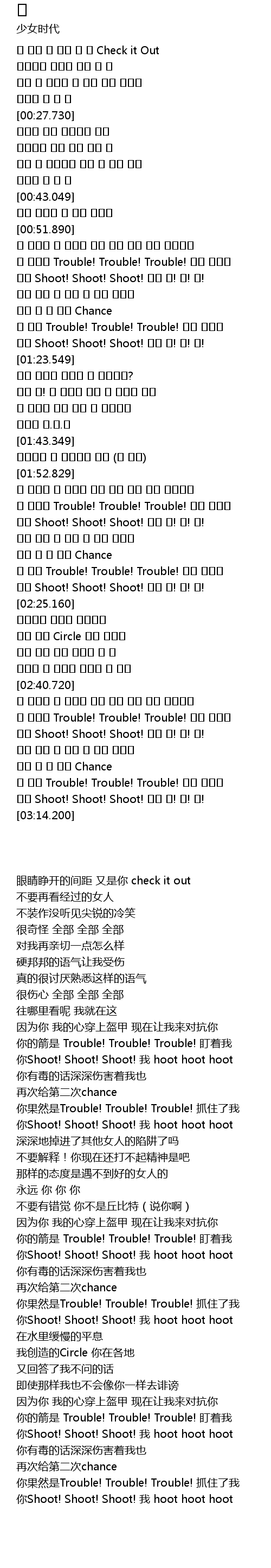 | [02:00.099] | 네 화살은 Trouble! Trouble! Trouble! 나를 노렸어 |