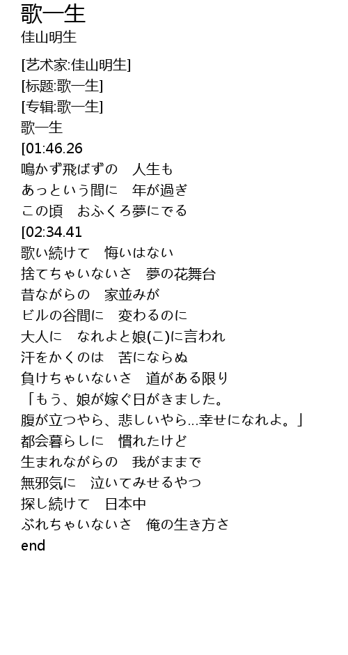 | [01:06.29][02:34.41][04:15.82] | いい詩(うた) いい節 泣ける唄 |