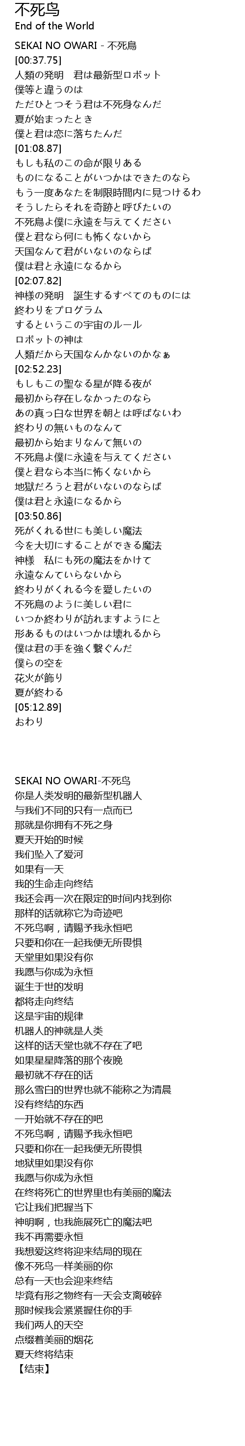 | [00:00.00] | SEKAI NO OWARI - 不死鳥 |