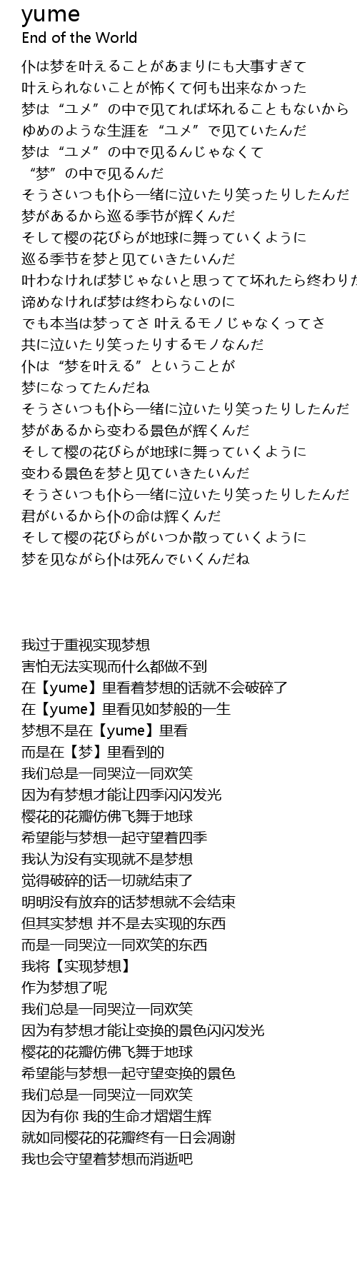 | [01:11.99] | 叶わなければ梦じゃないと思ってて坏れたら终わりだと思ってた |