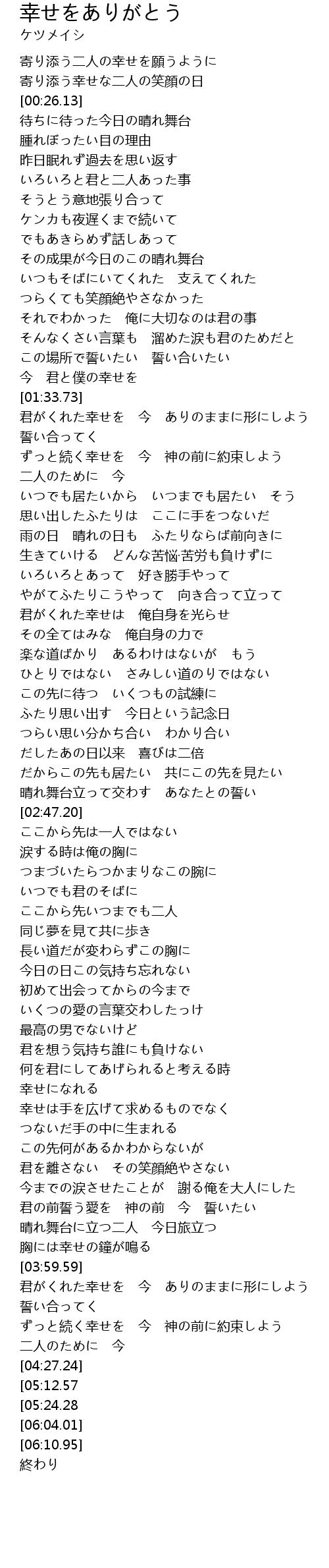 | [05:47.48][05:24.28][05:01.09] | 寄り添う幸せな二人の笑顔の日 |