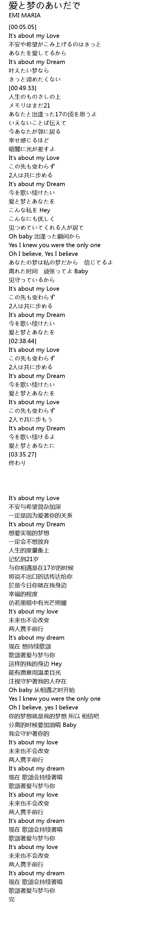 | [01:58.21] | あなたの梦は私の梦だから 信じてるよ |