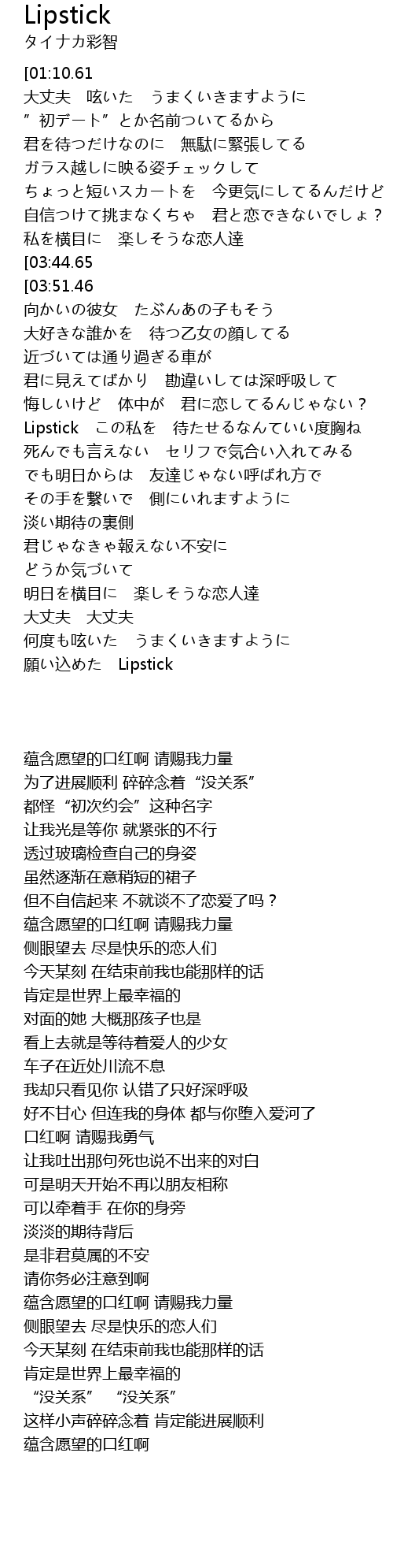 | [00:00.00][01:10.61][03:30.72] | Lipstick 願い込めた どうか力を貸してお願い |