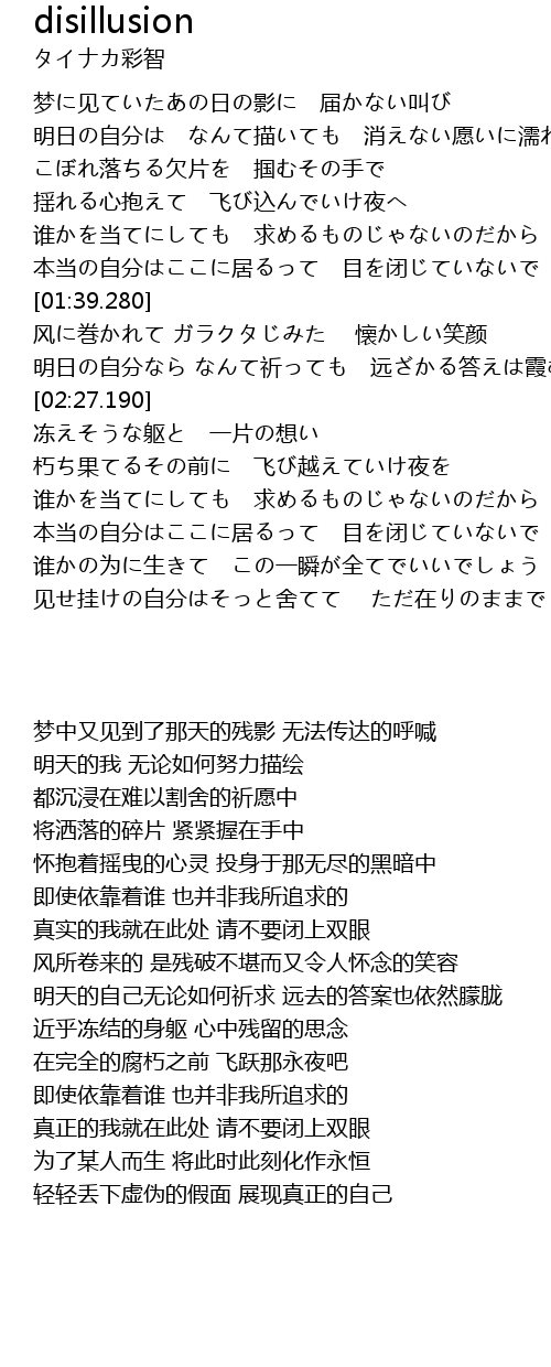 | [03:31.609] | 见せ挂けの自分はそっと舍てて ただ在りのままで |