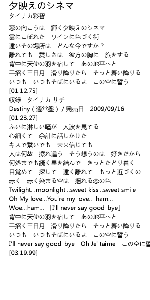 | [01:14.75] | 収録:タイナカ サチ - Destiny(通常盤)/発売日:2009/09/16 |