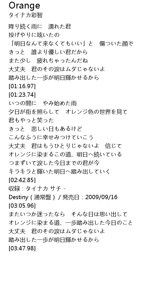 | [03:17.49] | オレンジに染まる道、一歩踏み出した今日のこと |