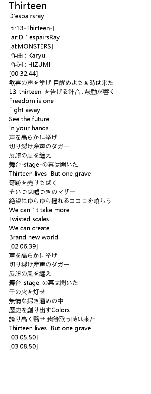 | [00:41.33] | 13-thirteen-を告げる針音...鼓動が響く |