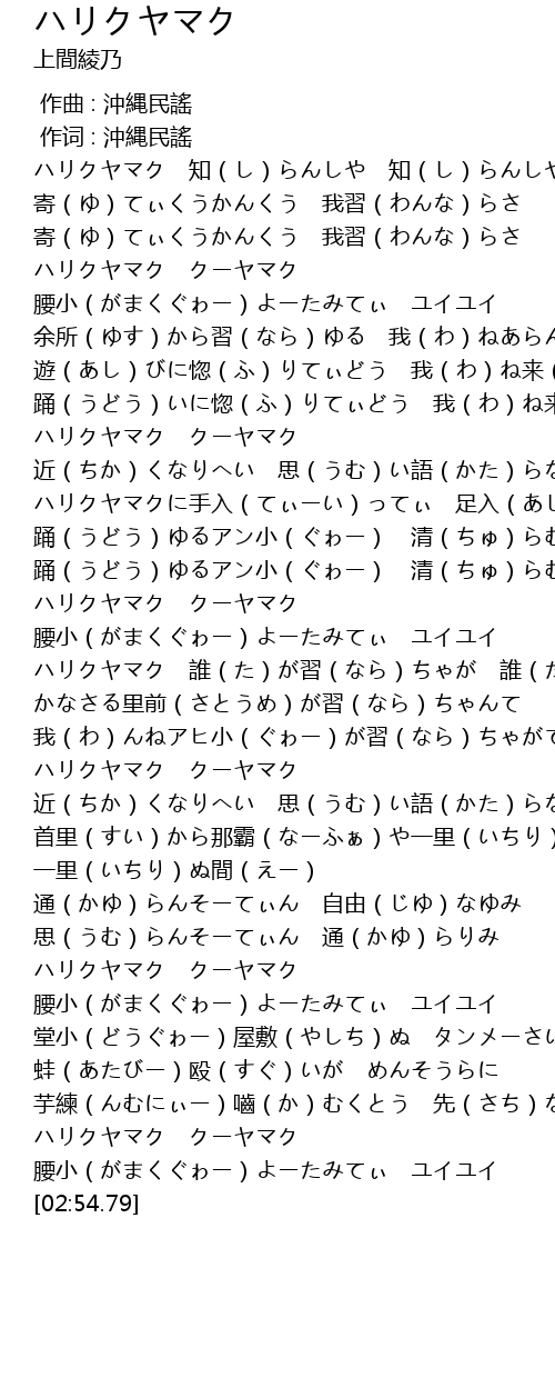 | [00:12.80] | ハリクヤマク 知(し)らんしや 知(し)らんしや |