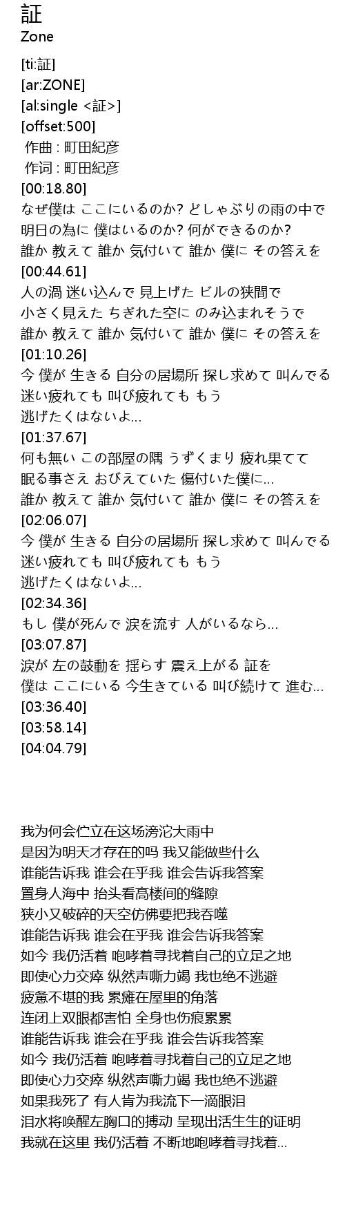 | [00:20.80] | なぜ僕は ここにいるのか? どしゃぶりの雨の中で |