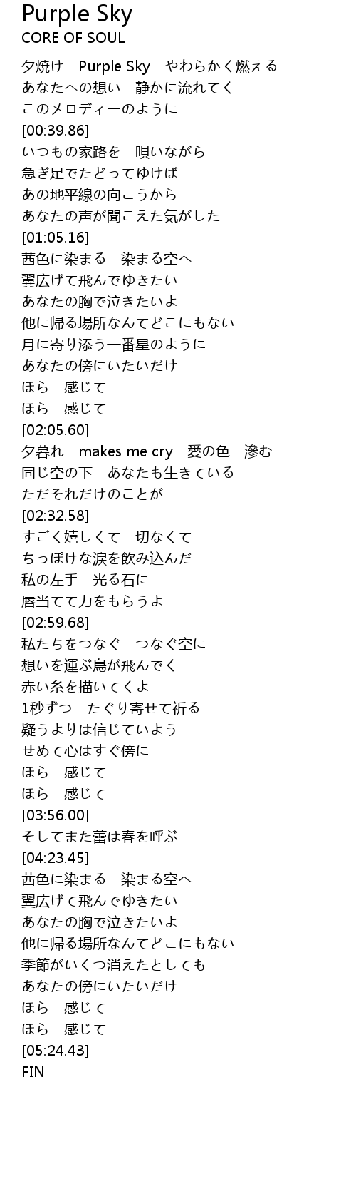 | [00:18.03] | 夕焼け Purple Sky やわらかく燃える |