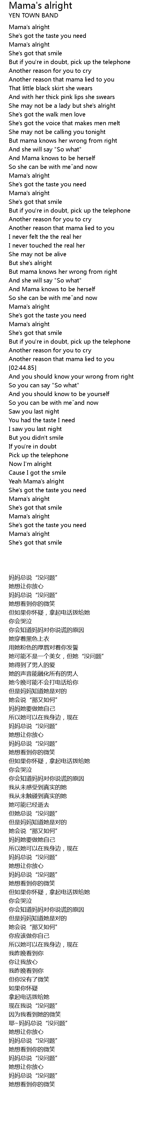 | [03:33.34] | Mama's alright |