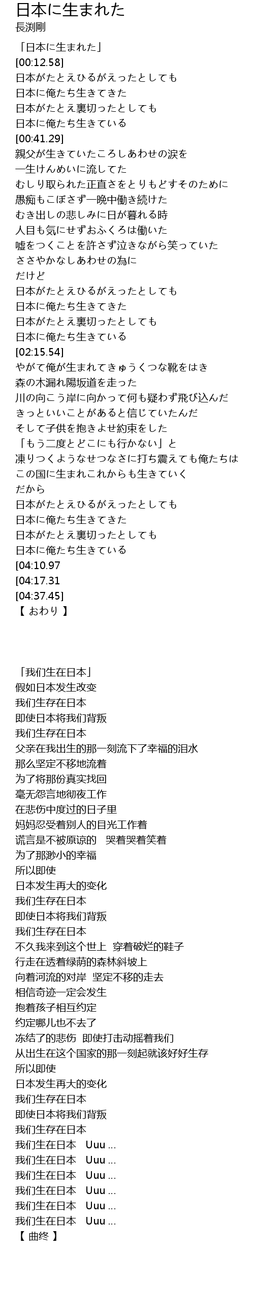 | [04:30.99][04:17.31][04:03.55] | 日本に生まれた Uuu… |