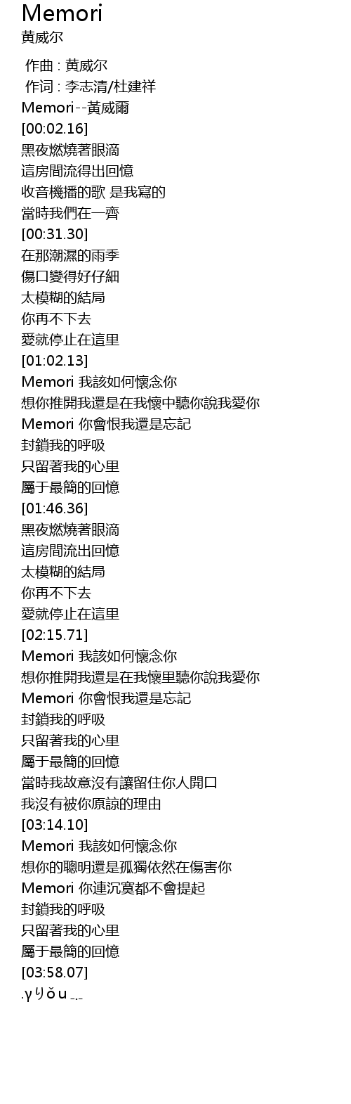 | [02:31.52] | Memori nǐ huì hèn wǒ hái shì wàng jì |