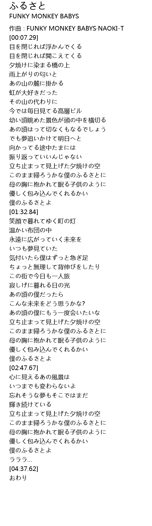 | [00:03.29] | 作曲∶FUNKY MONKEY BABYS·NAOKI-T |