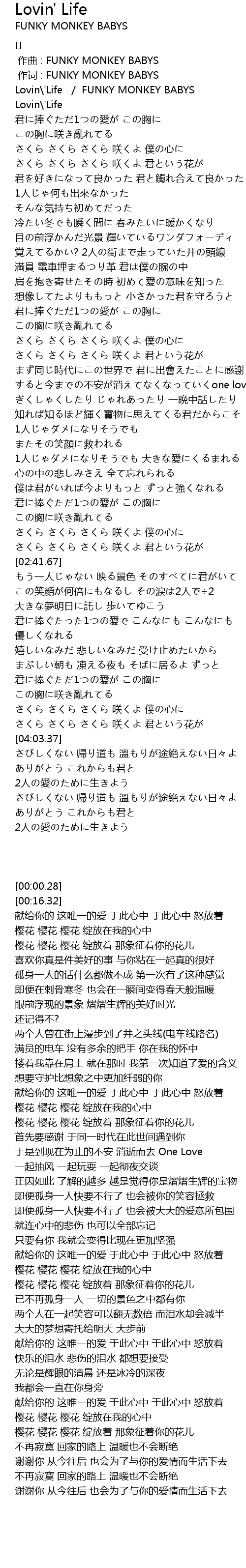 | [00:00.28] | Lovin' Life FUNKY MONKEY BABYS |