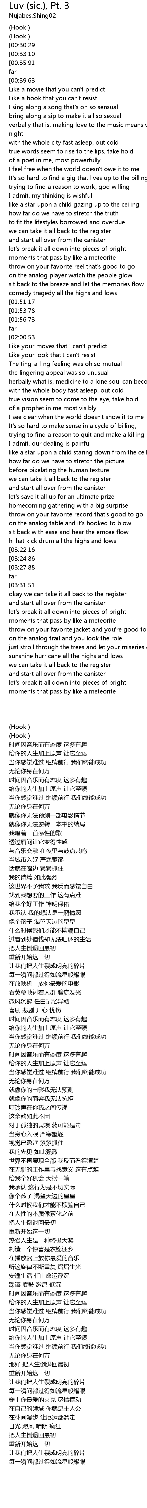 | [01:01.22] | verbally that is, making love to the music means vibing to the beat at night |