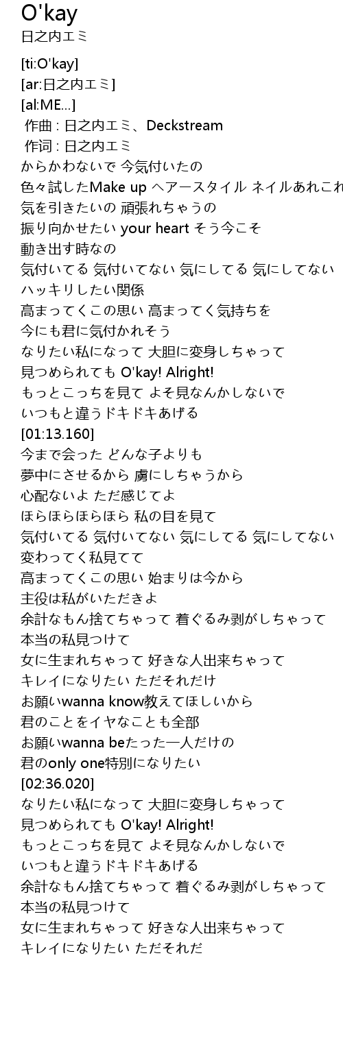 | [02:44.680] | 見つめられても O'kay! Alright! |