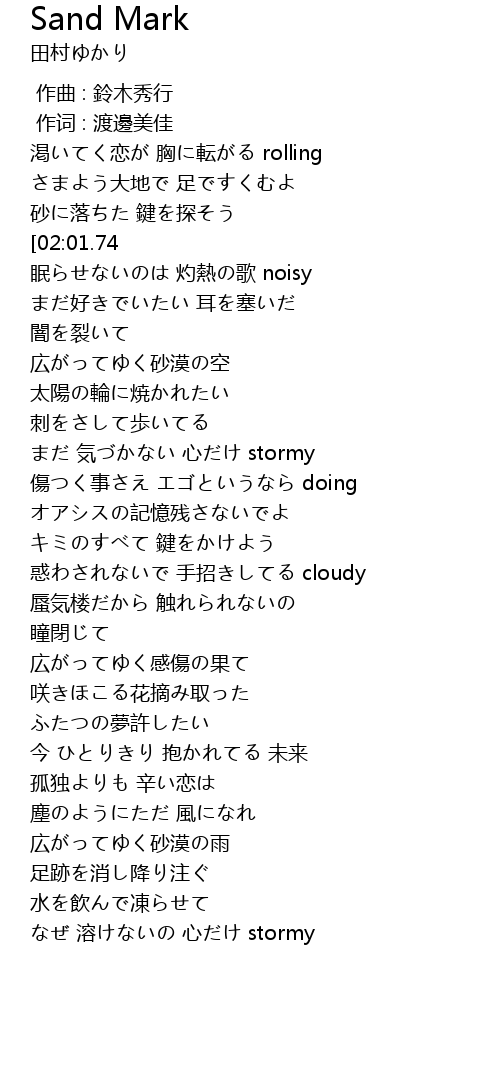 | [03:43.17] | なぜ 溶けないの 心だけ stormy |