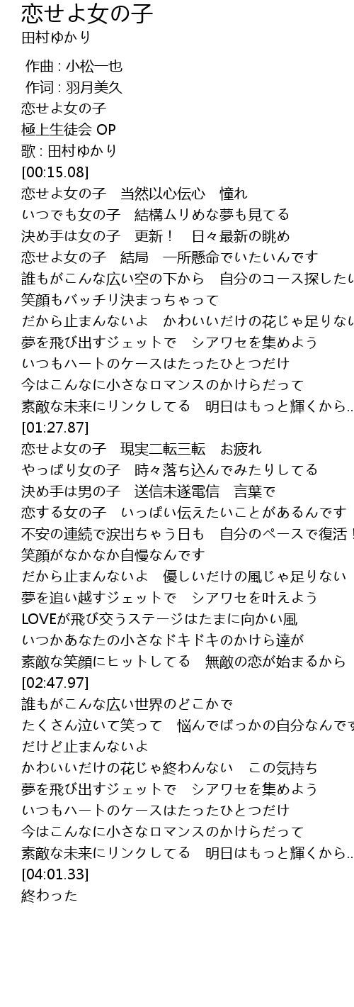 | [00:17.08] | 恋せよ女の子 当然以心伝心 憧れ |