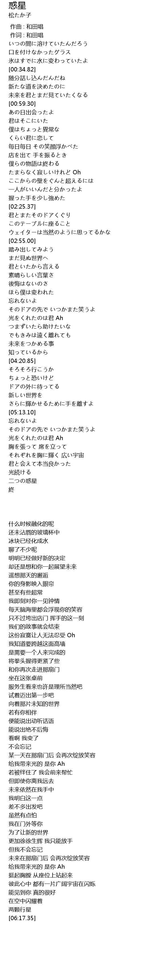 | [05:46.50] | それぞれを胸に輝く 広い宇宙 |