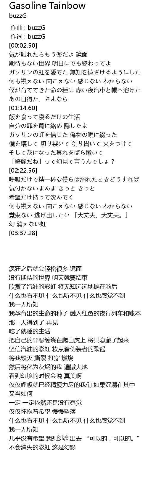 | [01:39.74] | ガソリンの虹を信じた 偽物の唄に綴った |