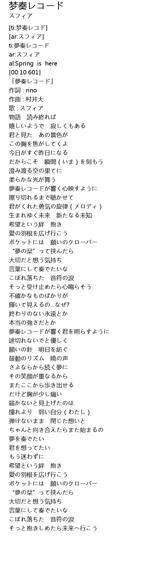 | [02:51.848] | 夢奏レコードが響く君を照らすように |