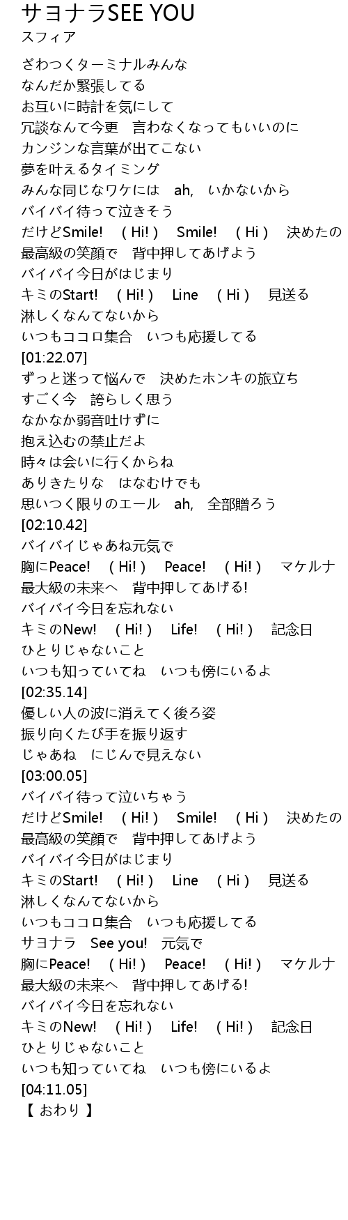 | [03:35.30] | キミのStart! (Hi!) Line (Hi) 見送る |