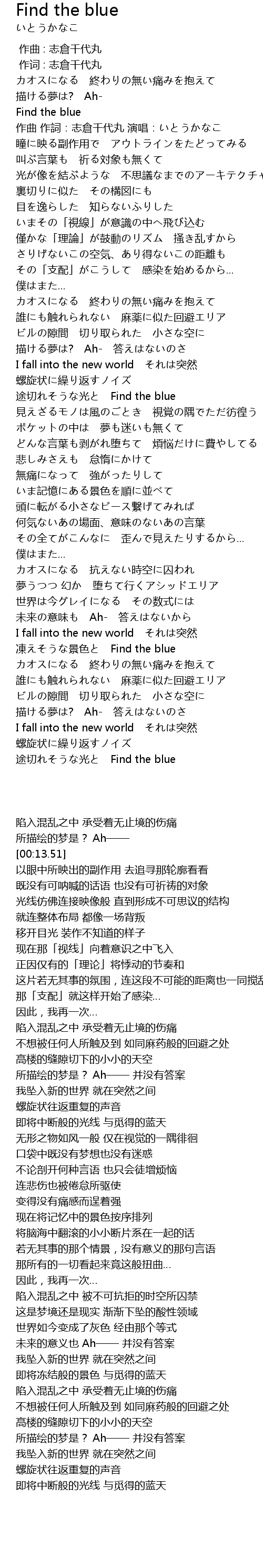 | [03:32.02] | 凍えそうな景色と Find the blue |