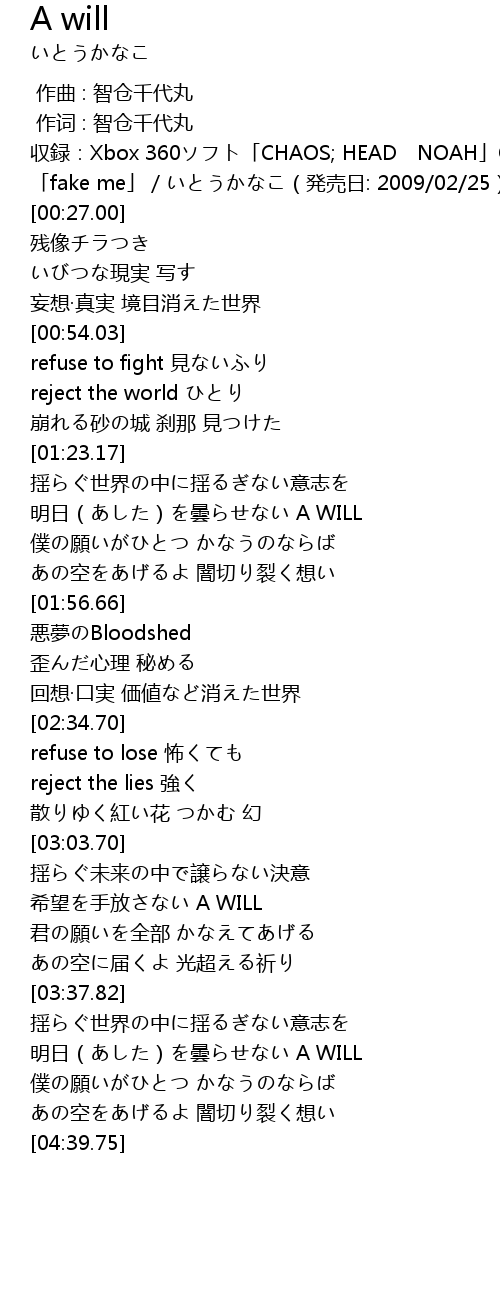 | [00:16.00] | 収録:Xbox 360ソフト「CHAOS; HEAD NOAH」OP - |
