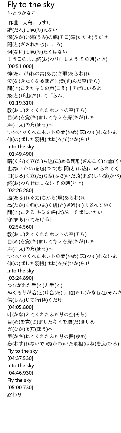 | [02:55.200] | 教(おし)えてくれたホントの空(そら) 目(め)を覚(さ)ましてキミを探(さが)した 声(こえ)の方(ほう)へ |