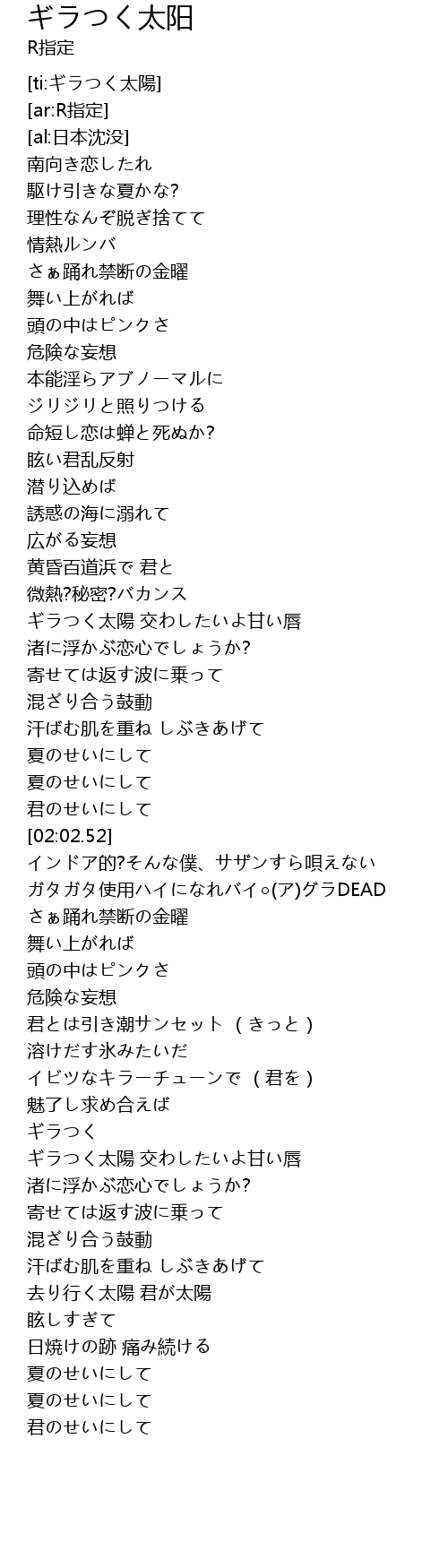 | [03:19.35] | ギラつく太陽 交わしたいよ甘い唇 |