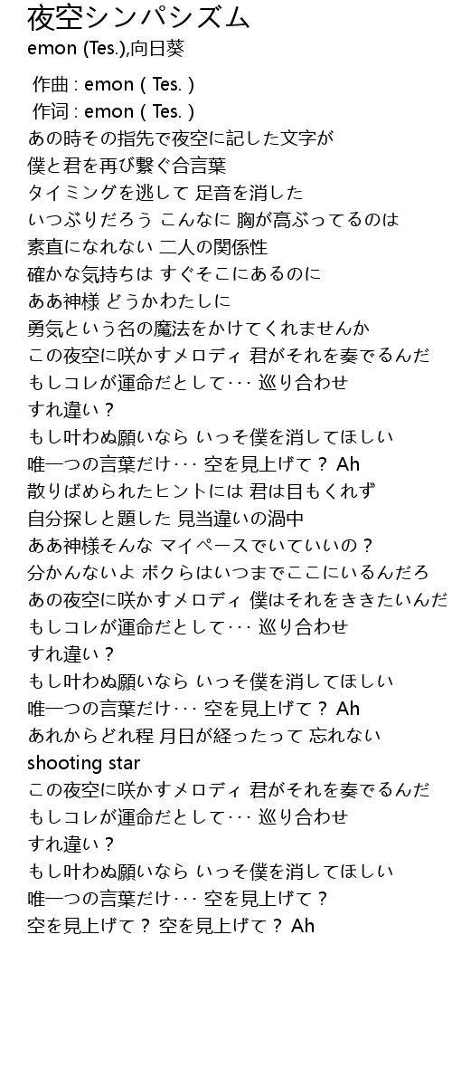 | [02:53.56] | あの夜空に咲かすメロディ 僕はそれをききたいんだ |