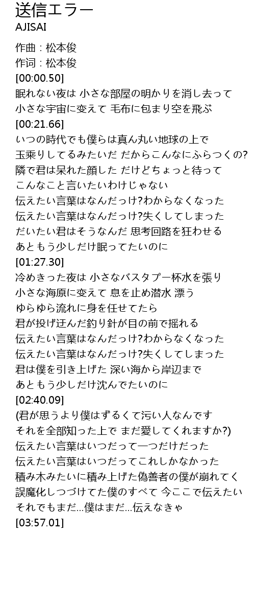 | [00:58.06] | 伝えたい言葉はなんだっけ?わからなくなった |