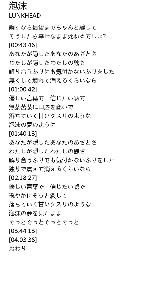| [03:20.91] | 泡沫の夢を見たまま |