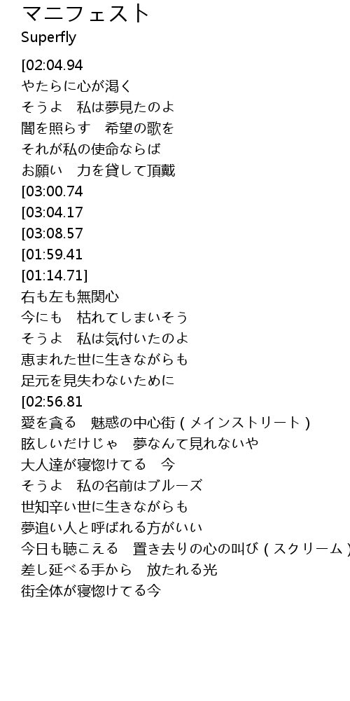 | [00:17.00][02:04.94][03:32.89] | Superfly-マニフェスト |