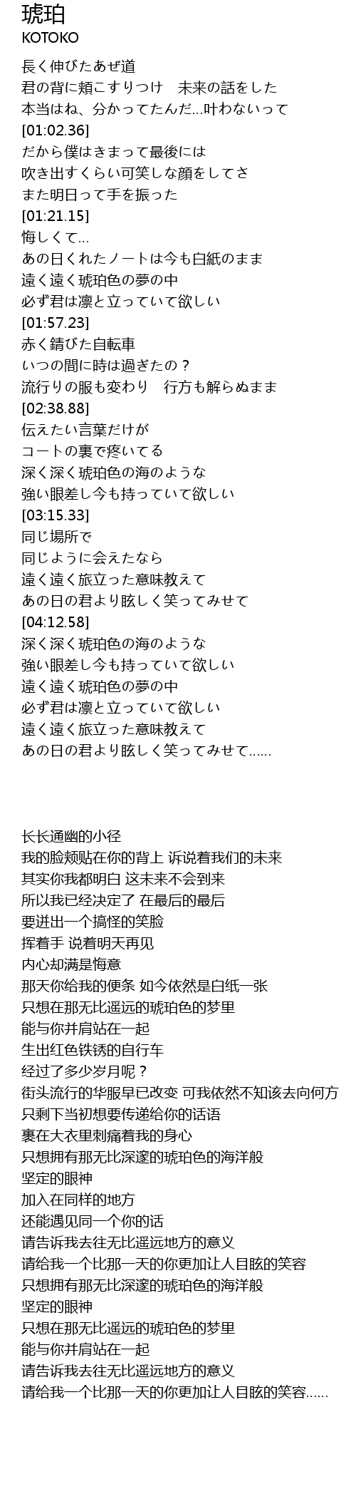 | [01:34.69] | 遠く遠く琥珀色の夢の中 |