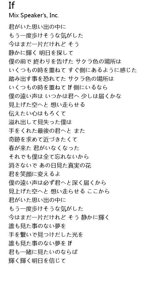| [02:09.090] | いくつもの時を重ねて If 側にいるなら |