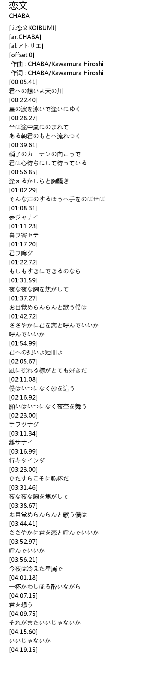 | [00:00.00] | zuo qu : CHABA Kawamura Hiroshi |