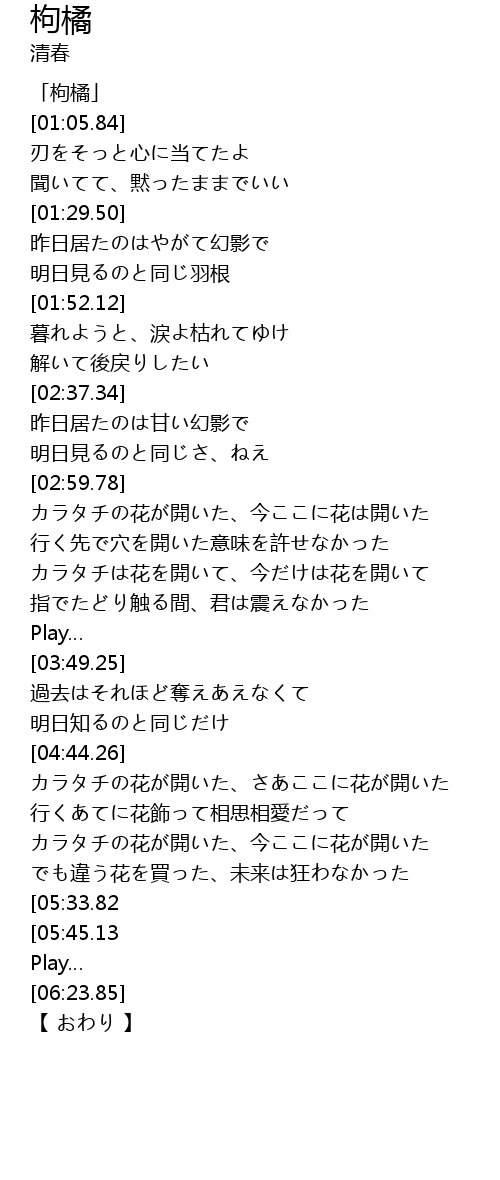 | [03:24.64] | カラタチは花を開いて、今だけは花を開いて |