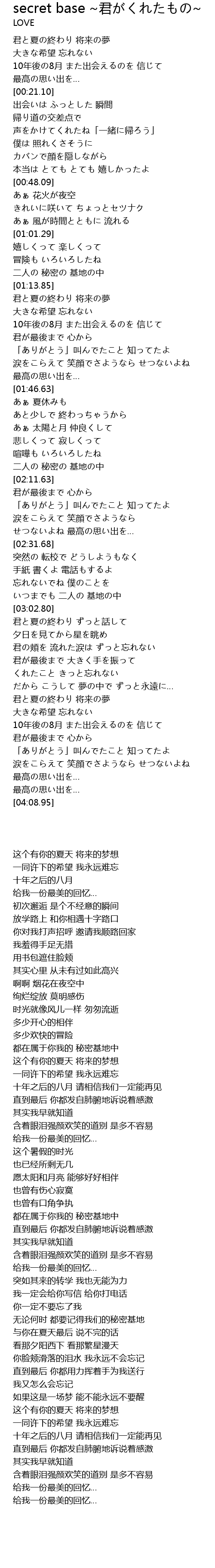 | [01:21.41] | 10年後の8月 また出会えるのを 信じて |